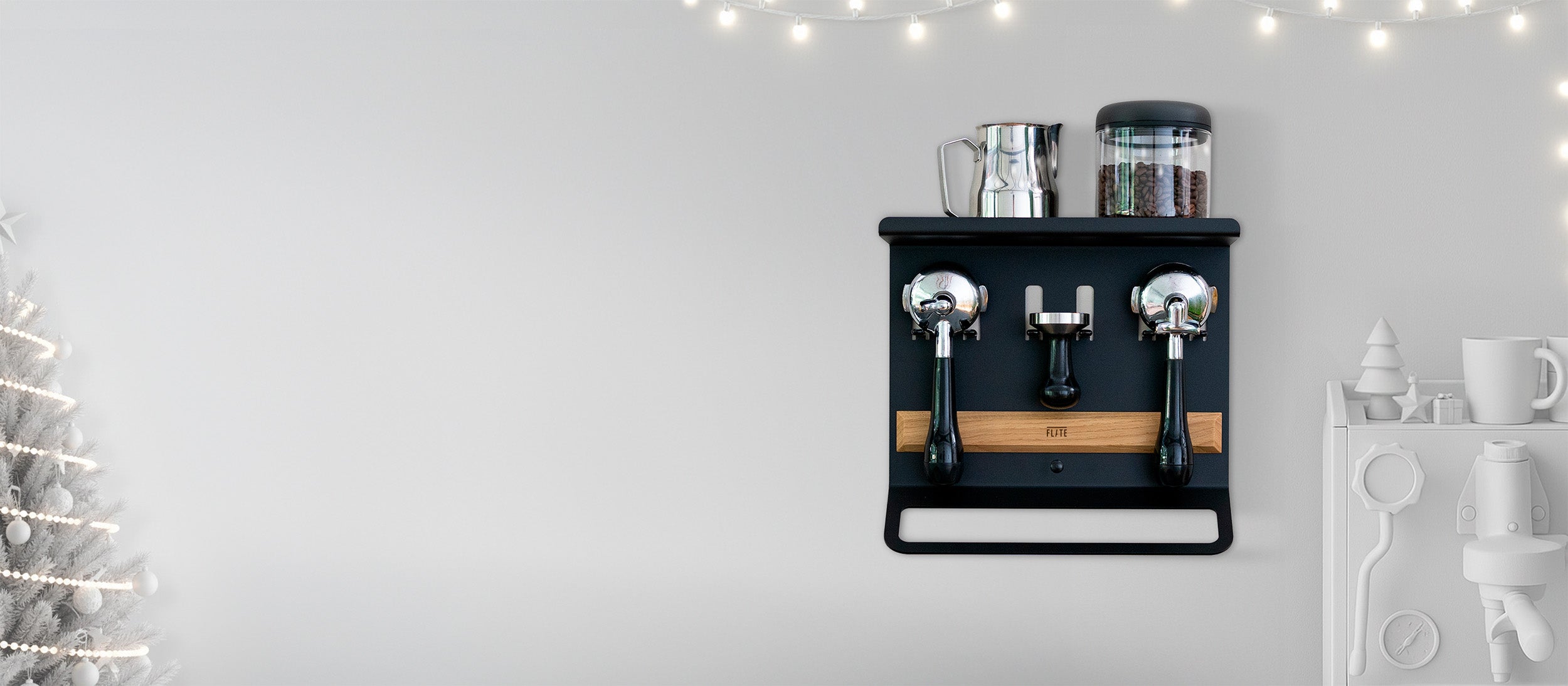 Die FLATE® Barista Regale bringen Ordnung in deine Kaffeebar, egal welche Maschine du besitzt oder wie viel Platz du hast. In zwei verschiedenen Größen findest du die passenden Halterungen und Ablage-Möglichkeiten, die du benötigst.