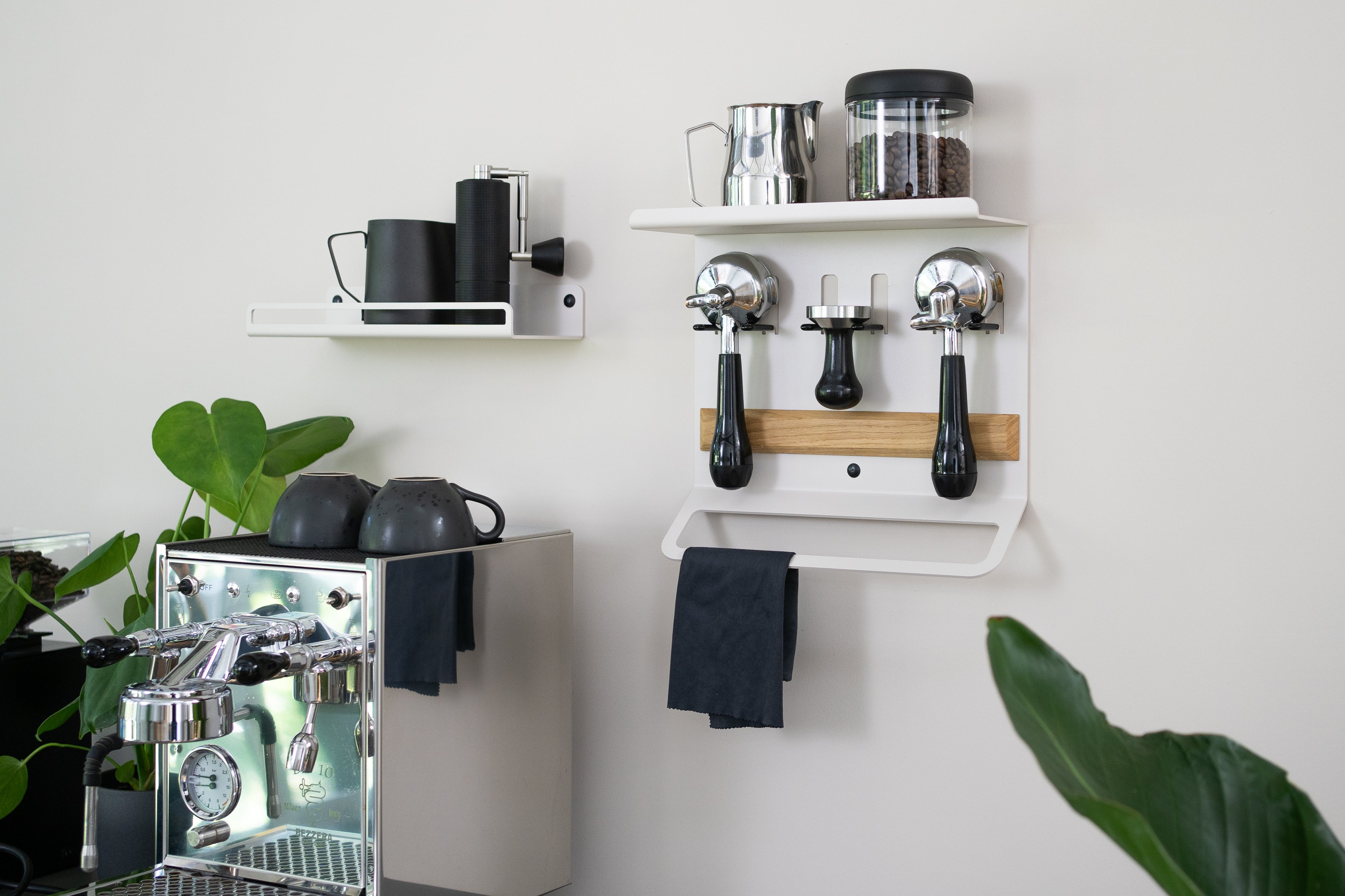 Das FLATE® Barista Board ist aus robustem, pulverbeschichtetem Stahl gefertigt und bietet verschiedene Organisationsmöglichkeiten: Mit drei Halterungen für Siebträger oder Tamper, einer großzügigen Ablagefläche für zusätzliche Barista-Tools wie Waagen oder Bohnenbehälter, und einer Hängevorrichtung für Barista-Tücher oder Kännchen.