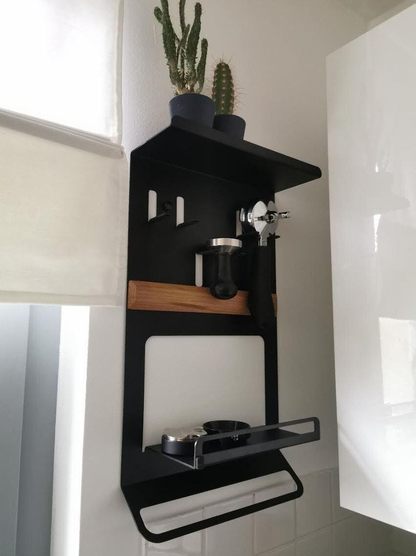 Das FLATE® Barista Board ist aus robustem, pulverbeschichtetem Stahl gefertigt und bietet verschiedene Organisationsmöglichkeiten: Mit drei Halterungen für Siebträger oder Tamper, einer großzügigen Ablagefläche für zusätzliche Barista-Tools wie Waagen oder Bohnenbehälter, und einer Hängevorrichtung für Barista-Tücher oder Kännchen.
