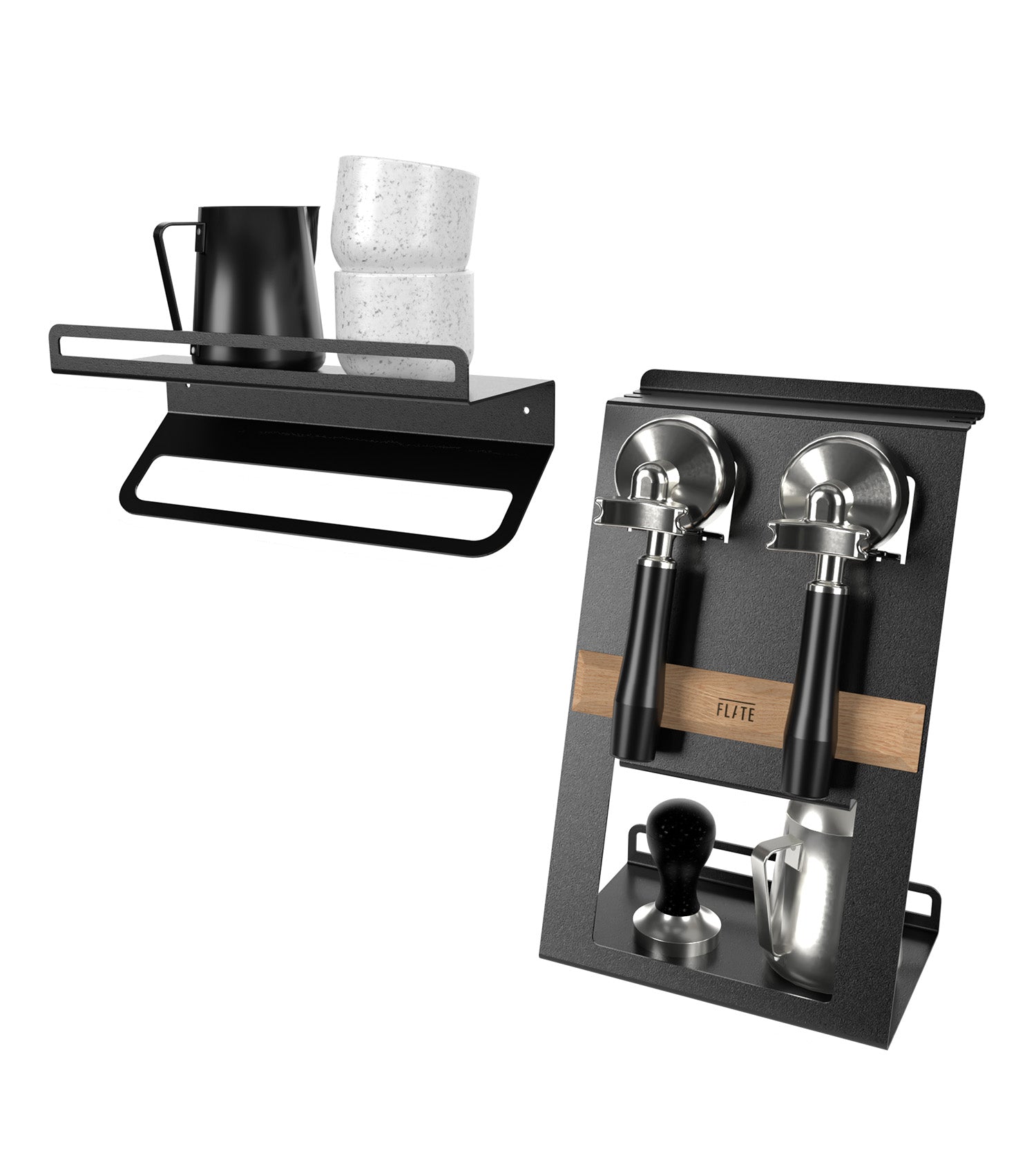 Die FLATE® Barista Regale bringen Ordnung in deine Kaffeebar, egal welche Maschine du besitzt oder wie viel Platz du hast. In zwei verschiedenen Größen findest du die passenden Halterungen und Ablage-Möglichkeiten, die du benötigst.